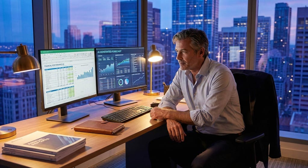 CFO analyzing financial data on dual screens in modern office at twilight, contemplating career evolution