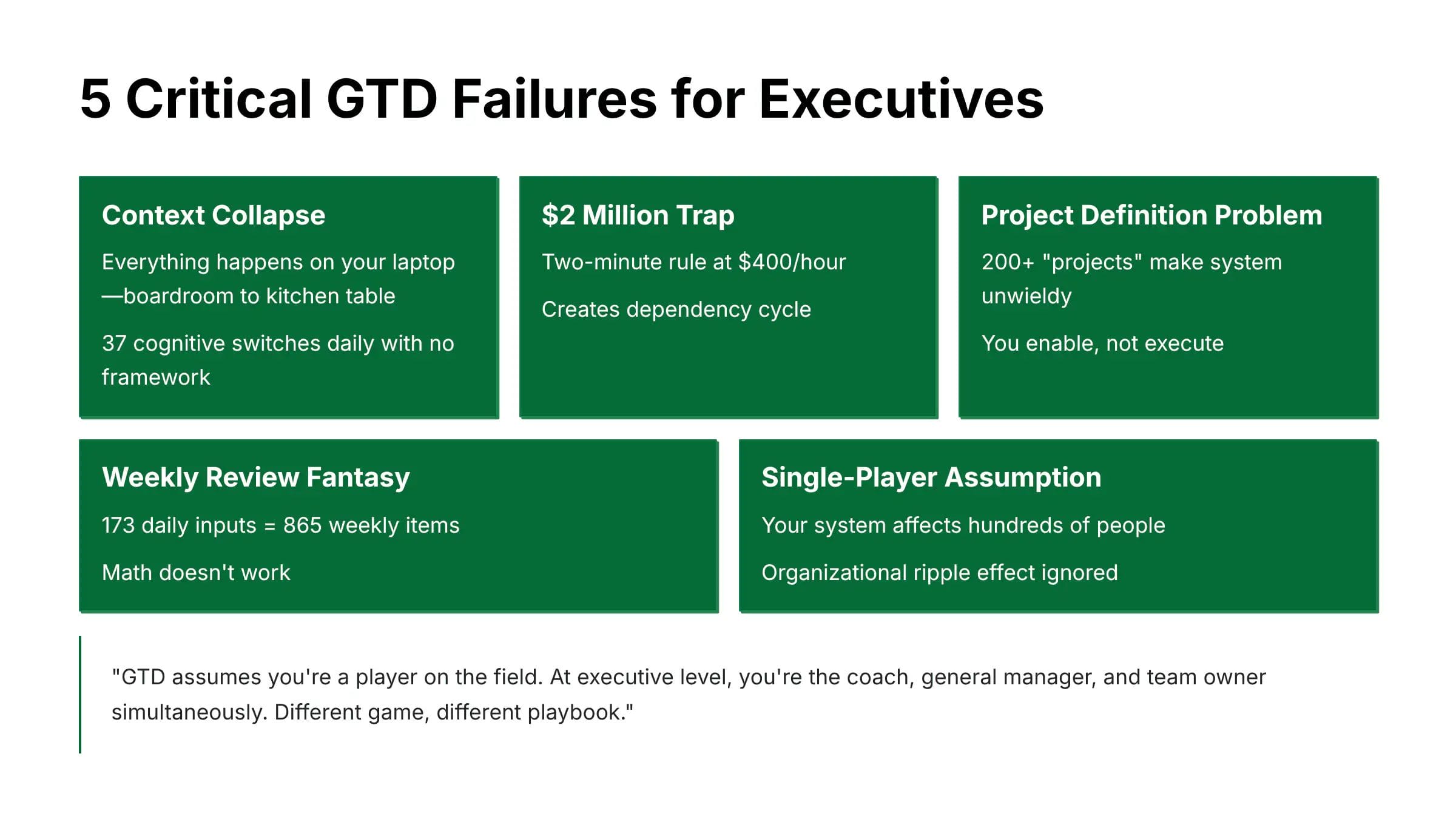 “GTD assumes you’re a player on the field. At executive level, you’re the coach, general manager, and team owner simultaneously. Different game, different playbook.”