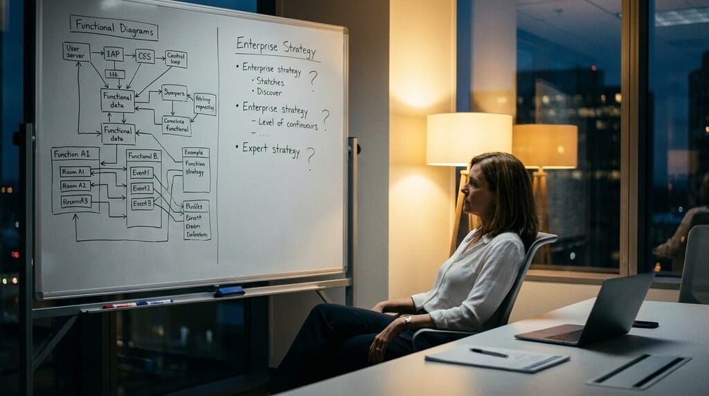 Each version of strategic thinking is legitimate. Each version is also bounded by the function that installed it. The finance leader’s strategy is about the numbers. The technology leader’s strategy is about the systems. The operations leader’s strategy is about the process. The feedback — “think more strategically” — is not asking for a better version of functional strategy. It is asking for something the function never taught.