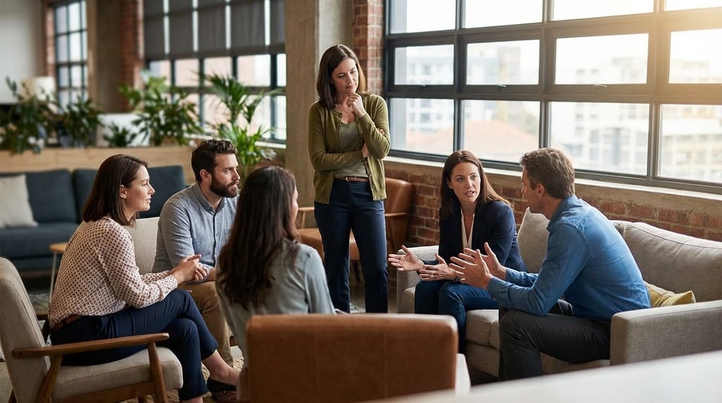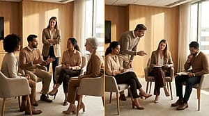 Coaching presence for teams requires the coach to resist the pull of becoming the center. In individual coaching, presence means full attention on one person. In team coaching, presence means holding awareness of the entire system: who is speaking, who is not, what is being said between the lines, and what the team is avoiding. The coach’s physical position matters. Standing outside the circle is a presence decision, not just a seating preference.